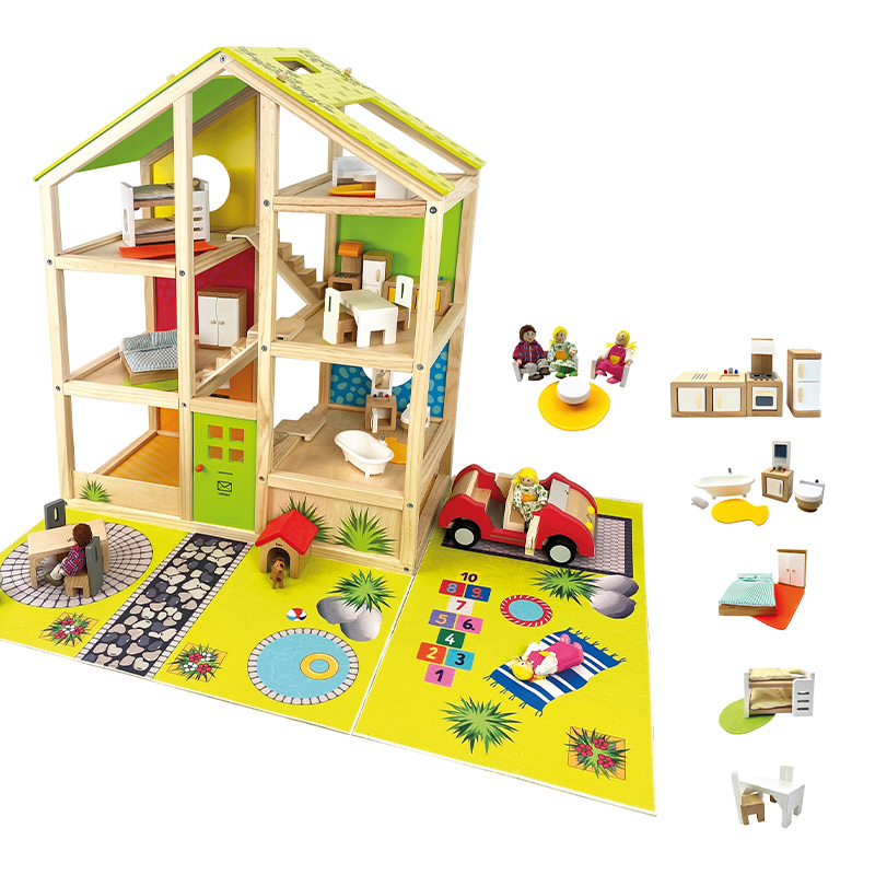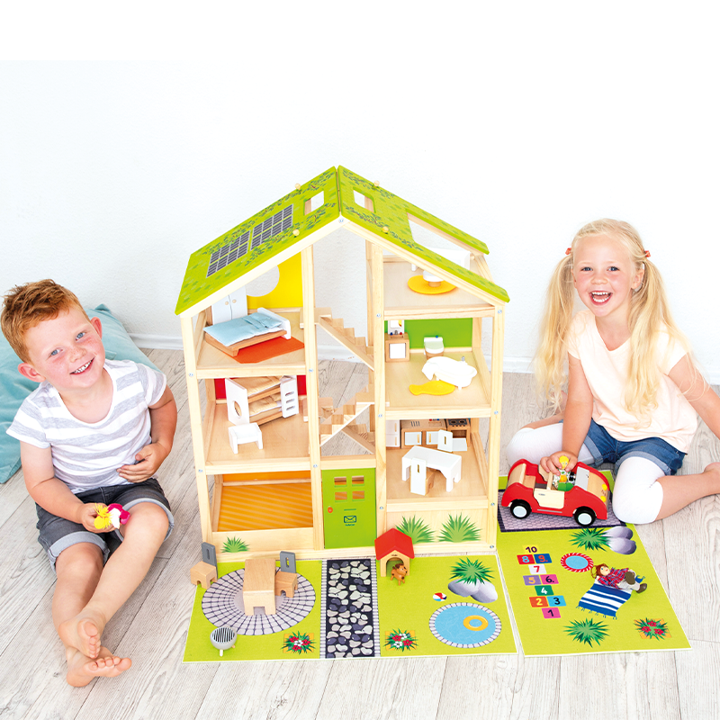 Die beiden Textilmatten für den Außenbereich verleihen dem Puppenhaus eine zusätzliche Dimension und ermöglichen es mehreren Kindern gemeinsam zu spielen und zu interagieren. Das Puppenhaus bietet genügend Platz, um die Vorstellungskraft der Kinder zu beflügeln und ihre Kreativität zu fördern.