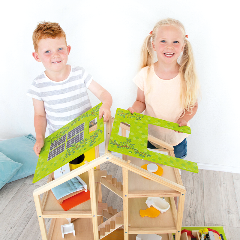 Das Dach kann von den Kindern selbst aufgelegt werden, was ein zusätzliches Element des Spaßes und der Herausforderung darstellt. Mit insgesamt 44 Teilen fördert das Puppenhaus die kreativen Fähigkeiten, soziale Kompetenz und das Selbstbewusstsein der Kinder.