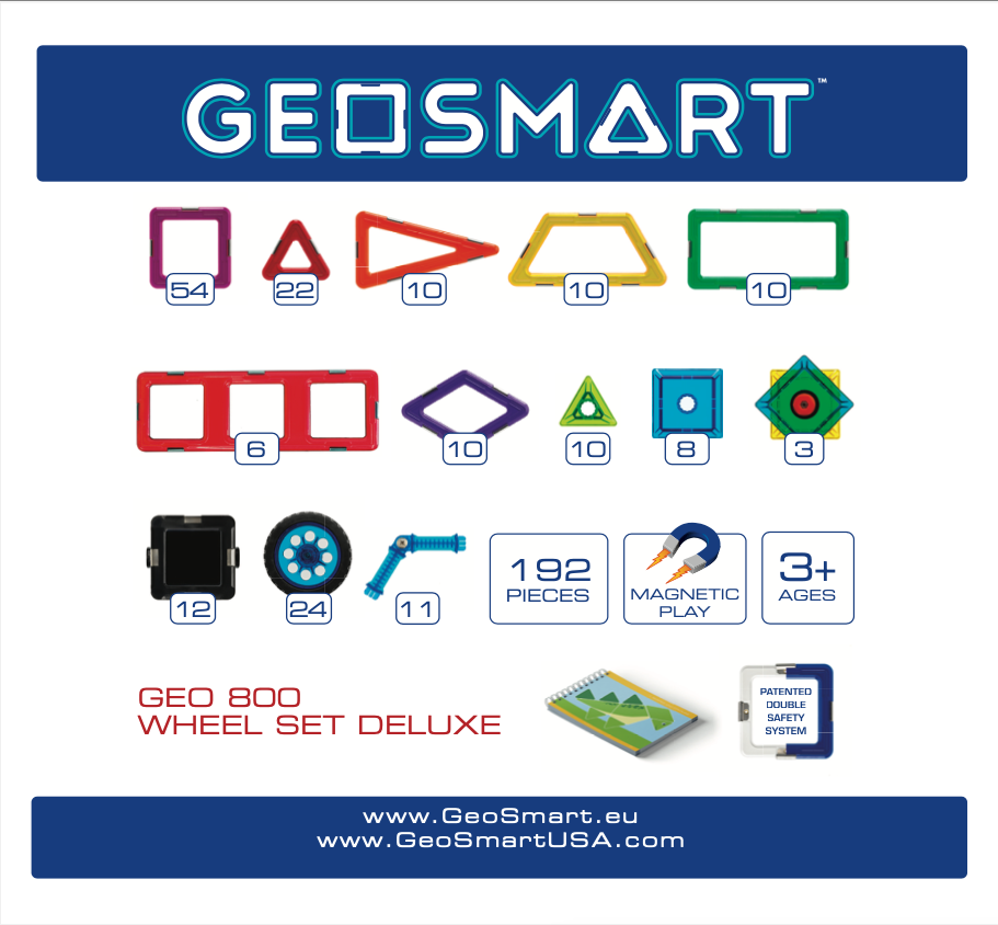 Das umfangreiche Super Set enthält 192 verschiedene geometrische Formen so wie Räder und Achsen, die für alle Altersgruppen geeignet sind.