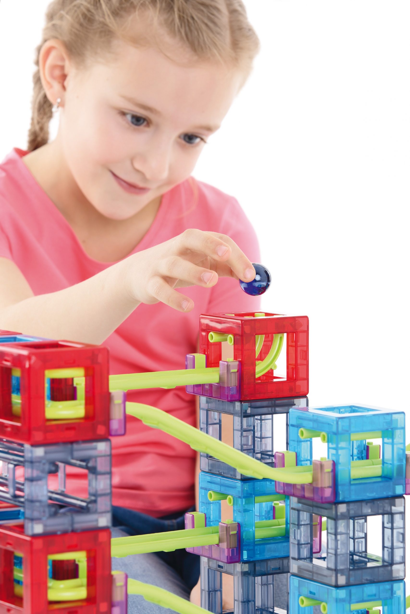 Das Basisset unserer einzigartigen Murmelbahn besteht aus 22 verschiedenen, magnetischen Bausteinen, die Ihre Kinder nach Belieben miteinander kombinieren können, um eine Bahn zu erschaffen, auf der die Murmeln rollen können. Durch das Gestalten der Strecken können Ihre Kinder ihre Vorstellungskraft ausleben und immer wieder neue Streckenverläufe kreieren.