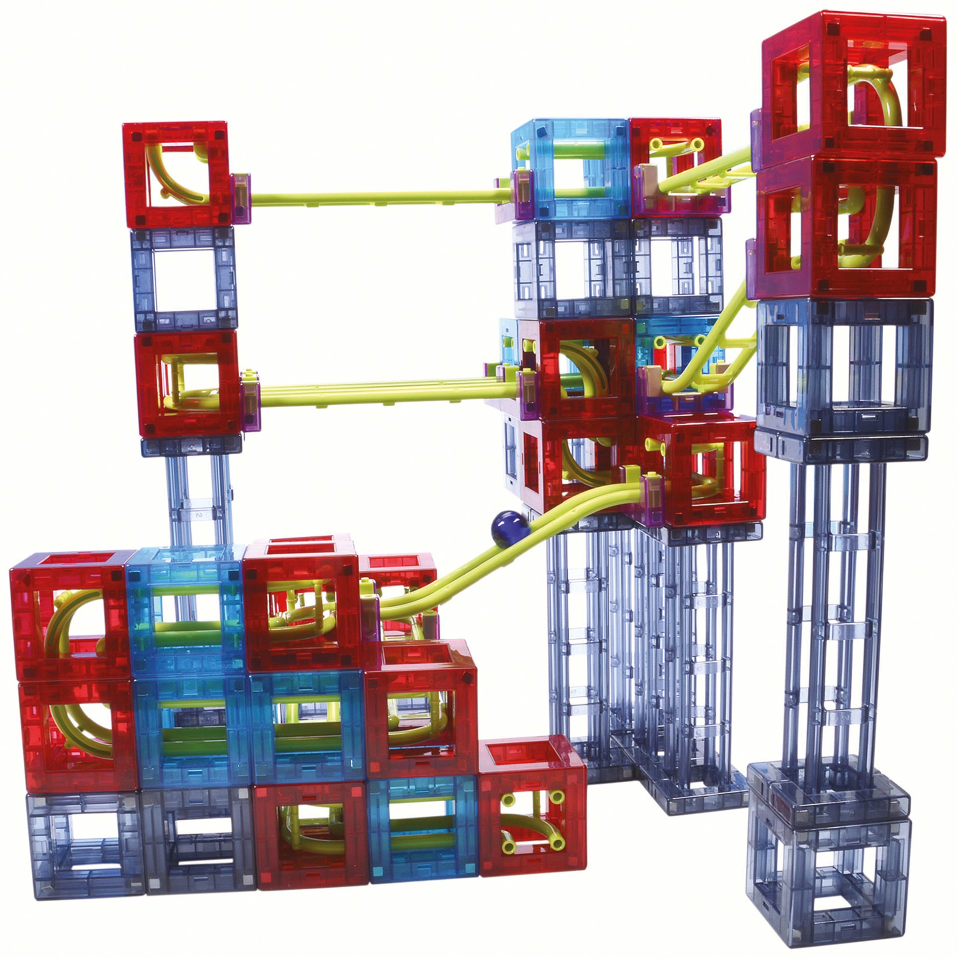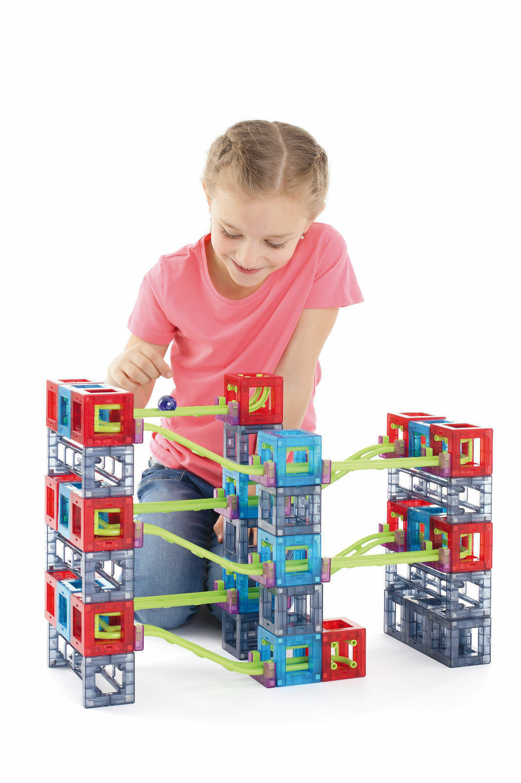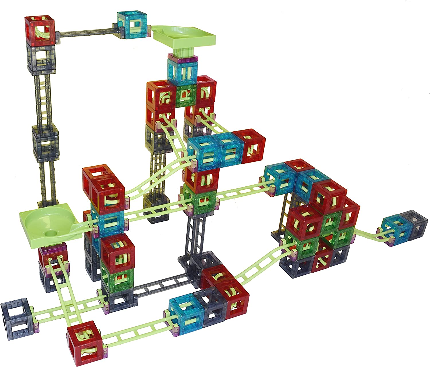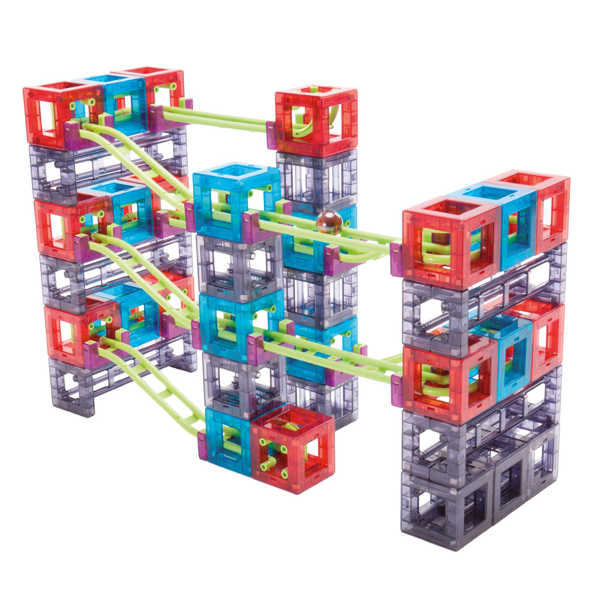 Die Magnetmurmelbahn besteht aus verschiedenen magnetischen Bausteinen, die die Kinder beliebig miteinander kombinieren können. Durch das Platzieren der Bausteine entsteht eine Strecke, auf der die Murmeln rollen können. Dabei können die Kinder ihre eigenen Ideen verwirklichen und immer wieder neue Streckenverläufe kreieren.