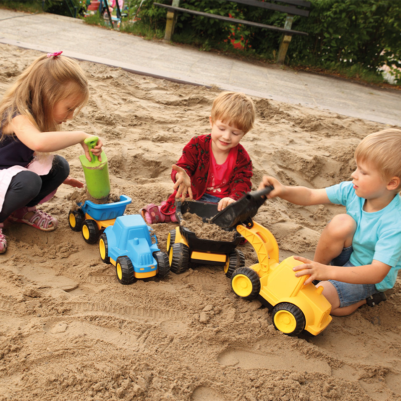 Mit dem Kipplaster können Sand und Schnee schnell und einfach transportiert werden. Seine Ladefläche verfügt über eine praktische Kippfunktion, die das Be- und Entladen von Sand zum Kinderspiel macht. Der Kipplaster selbst besteht aus robustem, UV-beständigem Kunststoff und ist mit Stahlachsen ausgestattet, die für zusätzliche Stabilität sorgen. Die leisen EVA-Reifen hinterlassen außerdem tolle Spuren im Sand und Schnee.