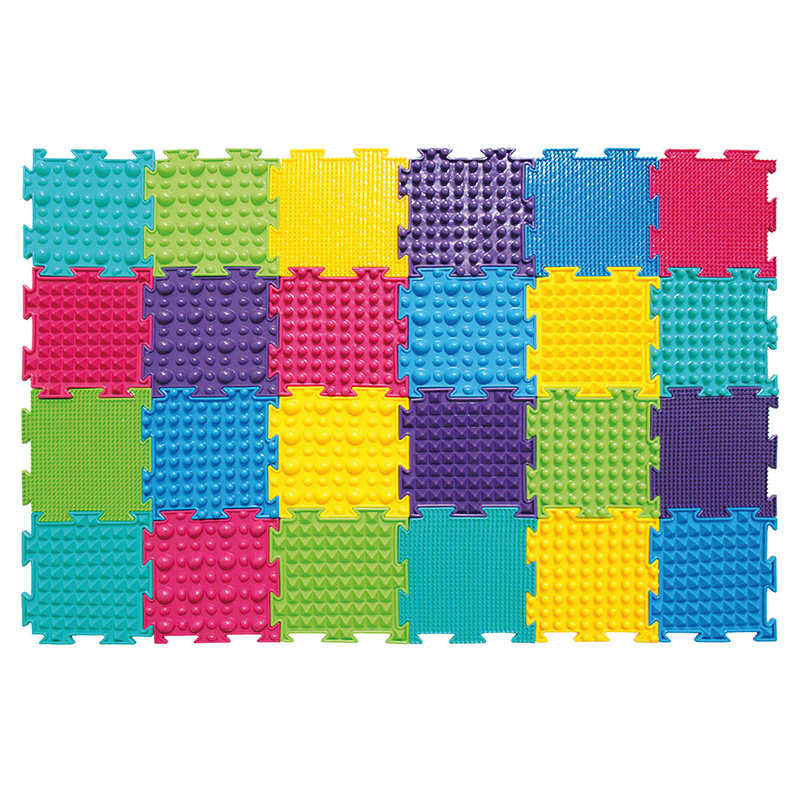 24 kleine Matten mit verschiedenen weichen oder harten Oberflächenstrukturen. Die Matten können beliebig zusammen gepuzzelt werden, 4 kleine Matten ergeben eine Große.