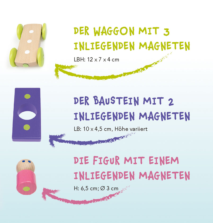 5 magnetische Waggons, 6 Bausteine mit inliegenden Magneten, 9 Figuren (sortiert)